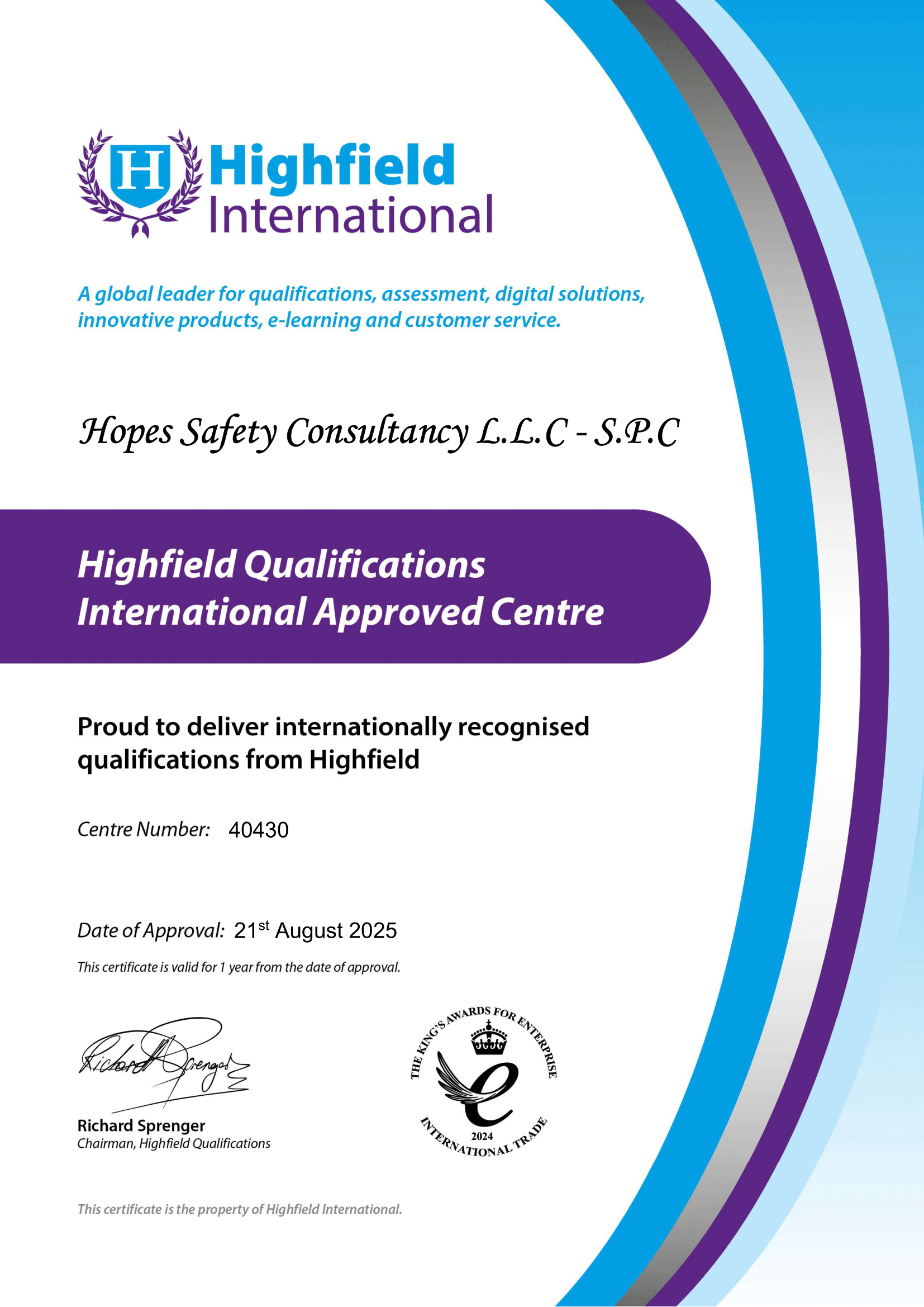 Hopes Safety Consultancy LLC SPC is proud to be certified to internationally recognized standards. These certifications demonstrate our strong commitment to quality, occupational health and safety, and environmental management. We operate under best practices and meet global benchmarks for delivering training and consultancy services.